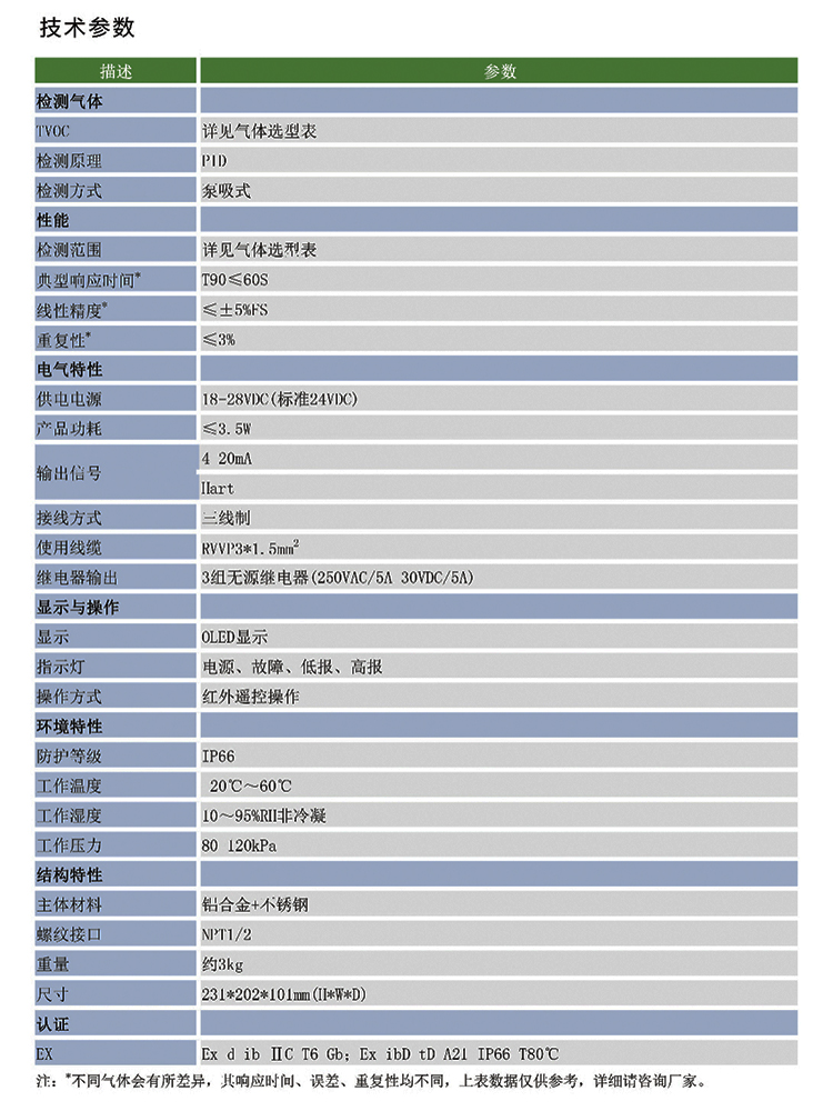 艾伊科技AG316氣體檢測(cè)變送器適用于檢測(cè)危險(xiǎn)區(qū)城中TVOC氣體的含量。產(chǎn)品采用聲光報(bào)警一體化設(shè)計(jì),可有效預(yù)警TVOC氣休泄?jié)M危險(xiǎn);模塊化設(shè)計(jì),維護(hù)方便;產(chǎn)品配有紅外通控器,可實(shí)現(xiàn)完全無(wú)開(kāi)蓋操作。IP66防護(hù)等級(jí)可適用于各類惡劣場(chǎng)合。產(chǎn)品采用內(nèi)置泵設(shè)計(jì),可準(zhǔn)確檢測(cè)揮發(fā)性有機(jī)物。